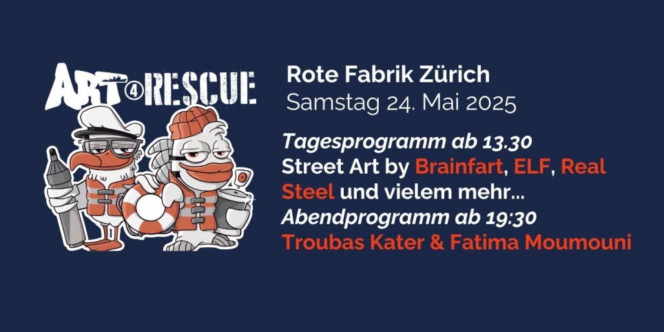 Mit Troubas Kater, Fatima Moumouni, LIVE-Street Art, Grafitti-Workshop, Kinderprogramm und vielem mehr! Am 24. Mai 2025 verwandelt sich die Rote Fabrik Zürich erneut in eine Bühne für Solidarität! Art4Rescue Vol. 2 vereint Musik, Kunst und Performances, um ein deutliches Zeichen für Menschlichkeit zu setzen und Spenden für die zivile Seenotrettung zu sammeln. Kunst bewegt, Kunst verbindet – und Kunst rettet Leben. Tagesprogramm – Kreativität trifft Solidarität Ab 13:30 Uhr – Innenhof, Foyer und Ziegel oh Lac Eintritt frei, Spenden für SOS MEDITERRANEE Street Art, Live Graffiti’s, & Workshop von und mit unserem Partner von Brainfart, in Kooperation mit den Streetart Künstler:innen ELF und Real Steel Ausserdem ein spannend kreatives Kinder- & Jugendprogramm Für euer leibliches Wohl sorgt das sympathische Team der Ziegel oh Lac. Für Liebhaber:innen von Schweizer Craft Beer gibt es unser frisch gebrautes Soli-Bier "Maday - Das Zürcher Bier für einen guten Zweck" von Dr. Brauwolf. Abendprogramm - starke Texte und ein einmaliges Konzerterlebnis Ab 19:30 Uhr - Clubraum Rote Fabrik Live auf der Bühne:Fatima Moumouni - Wort-Akrobatik Troubas Kater - LIVE Music Eintritt nur mit gültigem Ticket Solidaritätsticket – 35 CHF (Mindestbeitrag) Rettungsticket – 50 CHF Leuchtturmticket – 65 CHF Grenzenlos-Ticket – freie Spende (für grenzenlose Solidarität und Menschlichkeit) Mit jedem Ticket unterstützt du die lebensrettende Arbeit von SOS MEDITERRANEE Schweiz. Jetzt Ticket sichern! Warum Art4Rescue? Noch immer verlieren jedes Jahr tausende Menschen auf der Flucht über das Mittelmeer ihr Leben – direkt vor unserer Haustür. Doch wir können etwas dagegen tun. Wir können die Rettungsleine für Menschen in Seenot sein und ihnen eine Chance auf Überleben geben. Mit Art4Rescue setzen wir ein Zeichen: Wir schauen nicht weg – wir handeln! Erlebe ein Festival, das Musik, Kunst und Menschlichkeit verbindet – und werde Teil einer Bewegung, die Leben rettet.