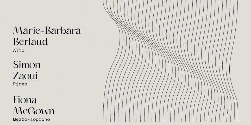 Marie-Barbara Berlaud Alto Simon Zaoui Piano Fiona McGown Mezzo-soprano Johannes Brahms, Zwei Gesänge, op. 91, pour mezzo, alto et piano Frank Bridge, Three Songs for mezzo-soprano, viola and piano Gabriel Fauré, La chanson d’Eve, pour mezzo et piano