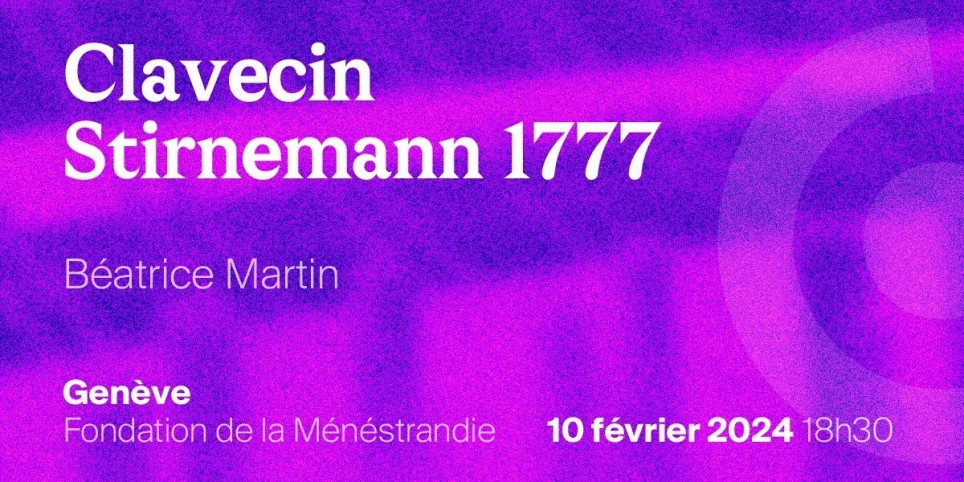 10èmes rencontres internationales harmoniquesSamedi 10 février 2024 17h Genève Musée d’art et d’histoire Voyage au XVIIIe siècle dans la collection du Musée d'art et d'histoire. Le clavecin est l'instrument roi des salons du XVIIIe siècle. En guise de mise en bouche au concert, la visite replace le clavecin dans son contexte culturel à travers la découverte de boiseries et de mobilier ou encore de portraits du siècle des lumières.     Samedi 10 février 2024 18h30 Genève Fondation de la Ménestrandie Béatrice Martin clavecin Fantaisies de Johann Sebastian Bach, Wilhelm Friedman Bach, Carl Philipp Emanuel Bach, Wolfgang Amadeus Mozart, sur le magnifique clavecin Jacob Stirnemann, Lyon, 1777https://www.beatricemartin-clavecin.com/