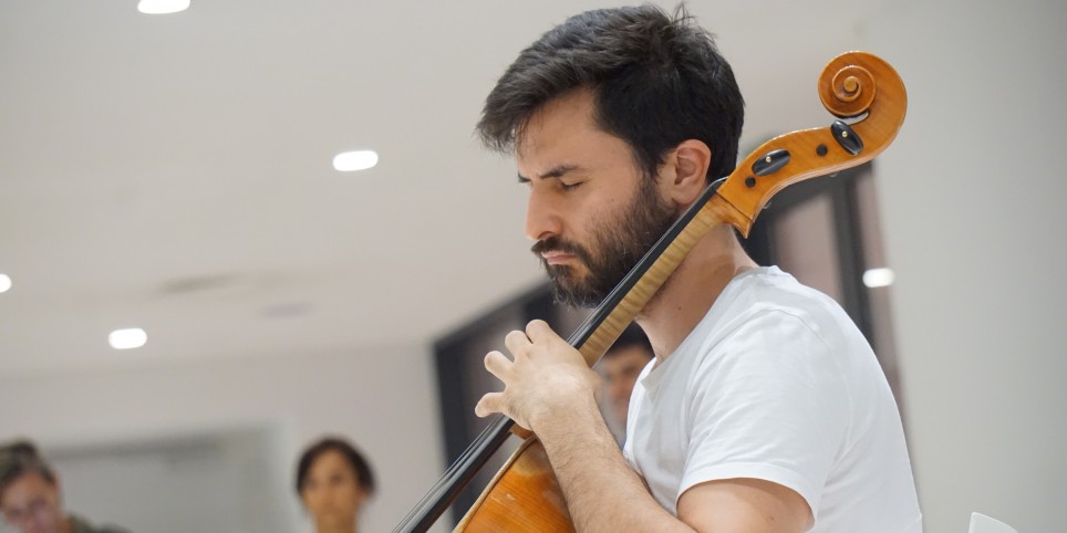 Be sure you have exhausted all that is communicated through stillness and silence. Ioannis Mandafounis and Brice Catherin have been each other's spectators for many years. They are also friends. As often happens when artists are friends, the idea of working together is born. Ioannis, the dancer, says: "I never have music in my shows because I love music and when there is music I want to sit and listen". Brice, the musician, says: "I never really know what to do with the dancers because when I see them I want to sit and watch them." And naturally the solution appears: dance in silence, then play almost still, then dance again in silence, then play again almost still, and so on. To take the time to meet, to listen to each other, to look at each other, to dive into the practice of the other, to impregnate oneself with it and to make it resurface in one's own practice. The dialogue established between Ioannis and Brice is made of long tirades, of ideas developed over twenty, thirty or forty minutes without interruptions, then taken up by the other, taken up again as one takes a relay, to go further, because these two stage dialecticians are not players but comrades. Then, at the turn of an episode of Jean-Luc Godard's Histoire(s) du cinéma, the latter pronounces this sentence of Robert Bresson, which resonates like a mantra: "Be sure you have exhausted all that is communicated through stillness and silence."