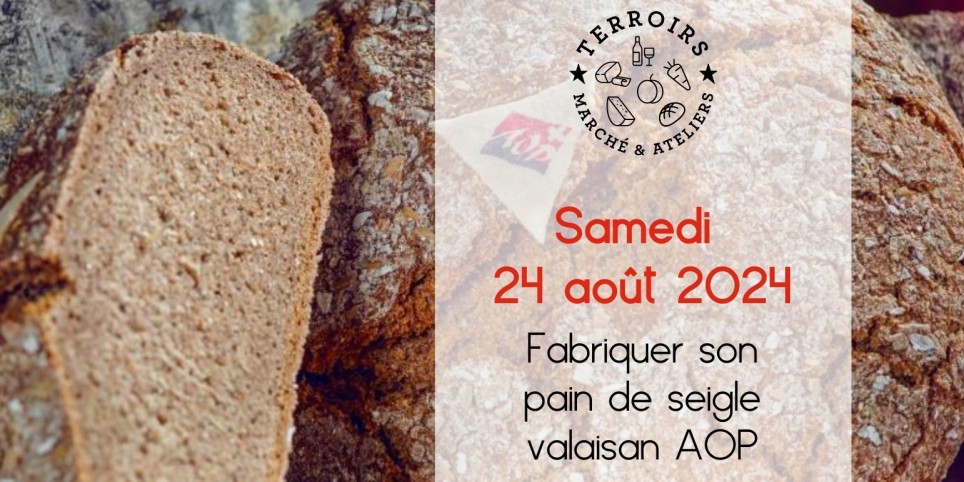 Mini-ateliers des terroirs Lors de l’événement Terroirs | Marché & Ateliers, qui se déroulera le samedi 24 août, des mini-ateliers des terroirs seront proposés tout au long de la journée ! Plongez dans l'univers de la boulangerie et découvrez son art lors de cet atelier animé par Christian Balet, un artisan boulanger passionné ! Vous apprendrez à confectionner votre propre pain de seigle valaisan AOP, en utilisant le levain nourri avec soin du boulanger. Vous aurez également l'opportunité d'en découvrir plus sur les techniques secrètes pour pétrir, façonner et cuire vos créations à la perfection ! Prêt à mettre les mains à la pâte ? Rejoignez-nous le 24 août 2024 pour un moment de convivialité où tradition, expertise, soleil et bonne humeur se rencontrent. Réservez dès maintenant votre place ! Informations Notre expert : Christian BaletLieu : Ferme de l'école d'agriculture du Valais, Av. Maurice-Troillet 260, 1951 Châteauneuf (Sion)Date : 24 août 2024Heure : De 11h00 à 17h00Prix : GratuitTemps : 30 minutesMaximum : 2-3 personnes à la fois À prendre avec soi Votre bonne humeur