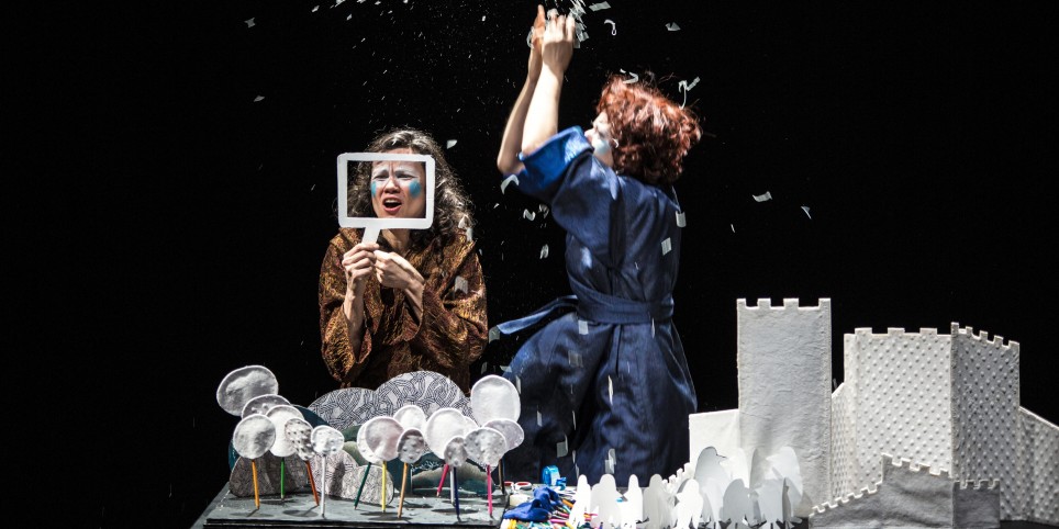Tiens, elles s’appellent Nathalie et Nathalie ! Et là, sous nos yeux, l’air de rien, elles fabriquent un conte enchanté joyeusement foutraque.Elles découpent des langues de papier, plantent des crayons, changent de rôles comme de couronnes, chantent à tue tête et nous donnent à voir le grand plaisir de jouer avec peu de choses. Dans cette histoire intemporelle, vous découvrirez une reine devineresse, un roi amoureux, un animal mythique, une météo chaotique, un peuple en colère et un chevalier à la Monthy Python, cataclop, cataclop …Un spectacle d’une grande liberté, léger comme du papier de soie, qui rappelle aux enfants que l’imagination s’attrape en jouant et qu’on peut inventer tout un univers avec juste du papier et des ciseaux !