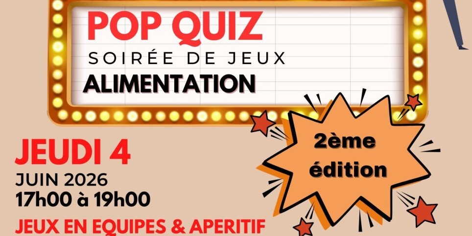 Venez vibrer avec nous pour la deuxième édition du Pop Quiz 100 % alimentation à Genève ! Vous aimez manger, rire, apprendre et soutenir des initiatives locales ? Ce quiz est fait pour vous. Pour cette deuxième édition à la Maison de l'Avenir, Gaëlle Bigler de B.R.E.A.D Collective et Justine Gaudard de ma-terre réunissent des équipes pas comme les autres pour se challenger autour de l'alimentation durable. Et vous ? Vous êtes invité·e à venir en tant que public, pour profiter du spectacle… mais pas seulement. En tant que spectateur·rice, vous pourrez : - soutenir les équipes en répondant à certaines questions - être tiré·e au sort pour rejoindre une équipe en cours de route Le tout dans une ambiance détendue et festive. Et pour finir en beauté : un apéritif local vous sera offert ! Venez seul·e, entre ami·es ou en famille avec votre curiosité et l’envie de partager un bon moment autour d’un sujet qui nous concerne toutes et tous. Ne manquez pas cette seconde édition qui promet d'être innoubliable !