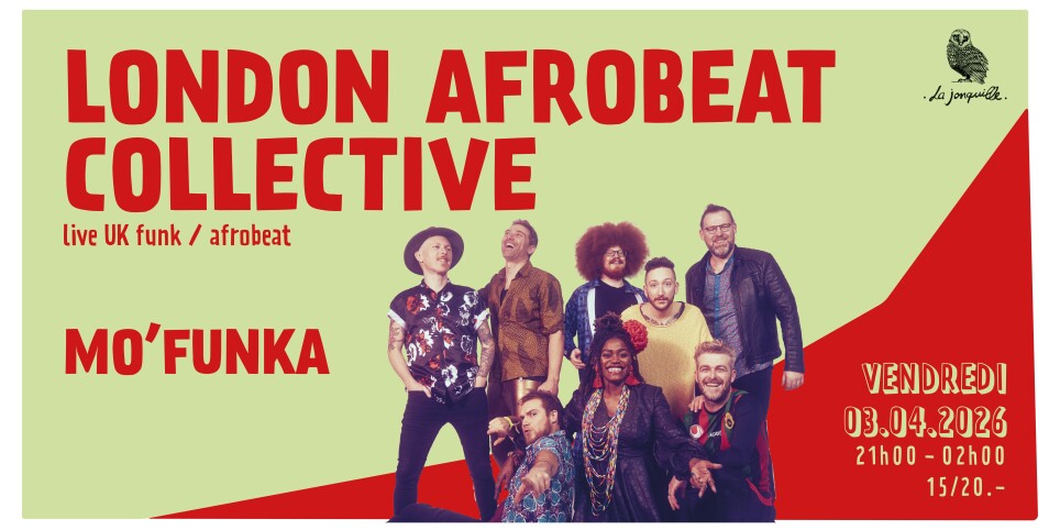 LONDON AFROBEAT COLLECTIVE 8 musiciens. Un objectif : augmenter l’énergie positive dans le monde en faisant danser les gens ! Le London Afrobeat Collective est une famille soudée de musiciens venus du monde entier, installés à Londres et unis par leur amour de l’afrobeat ainsi que par l’envie d’emmener la musique originale vers de nouveaux horizons.De l’Europe à l’Afrique, du Glastonbury Festival à la Felabration à Lagos, ils proposent une musique festive née de leur ADN véritablement mondial. Ce collectif de huit musiciens originaires d’Angleterre, d’Italie, de France, du Congo, d’Argentine et de Nouvelle-Zélande mêle afrobeat traditionnel, funk, jazz, rock, musiques latines et dub pour créer quelque chose d’unique. ✨ MO'FUNKA La Mo'Funka Familly dans tes oreilles ! Crew de Dj genevois actifs depuis 2015 en masta B2B ! Adepte du groove de multiples horizons, "take out your dancing shoes" la Mo' t'emmène en voyage ! Afrobeat/Disco/Break/House