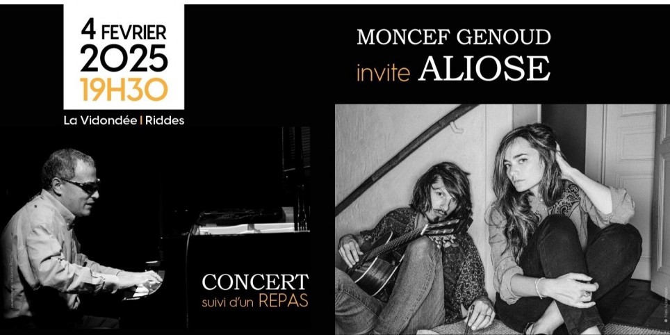Quand deux mondes se rencontrent Aliose et Moncef Genoud en concert à la Salle de la Vidondée Le mardi 4 février 2025 à 19h30, la Salle de la Vidondée à Riddes deviendra le théâtre d’une rencontre artistique exceptionnelle. Le duo suisse Aliose, connu pour ses mélodies poétiques et ses textes délicats, croisera son univers avec celui de Moncef Genoud, pianiste de jazz renommé pour sa virtuosité et ses improvisations riches d’émotion. Cette soirée promet de marier deux univers musicaux distincts, où la chanson francophone teintée de douceur et de profondeur d’Aliose rencontrera la liberté créative et les rythmes audacieux du jazz de Moncef Genoud. Ensemble, ils offriront une symbiose musicale unique, un dialogue entre poésie et improvisation, entre structure et spontanéité.   À propos des artistes : Aliose : Formé par Alizé Oswald et Xavier Michel, Aliose s’est imposé comme un incontournable de la scène francophone. Avec des mélodies aériennes et des textes touchants, leur musique fait écho aux émotions universelles. Leur complicité scénique renforce l’intimité de leurs prestations.   Moncef Genoud : Pianiste de jazz de renommée mondiale, Moncef Genoud allie virtuosité technique et sensibilité artistique. Connu pour ses collaborations prestigieuses et ses compositions novatrices, il est un maître dans l’art de réinventer les genres.   Cette soirée ne se limite pas à un concert. Elle propose une formule unique alliant musique et gastronomie, où le spectacle sera suivi d’un repas élaboré par La Maison des Résistants. Ce moment convivial, comprenant repas et boissons, prolongera l’expérience musicale en une fête des sens et des saveurs.   Informations pratiques :Lieu : Salle de la Vidondée, Chemin du Pied du Mont 1, 1908 RiddesDate et heure : Mardi 4 février 2025 à 19h30 ouverture des portes 19h00Tarif : Fr. 95.- (concert, repas et boissons compris)Contact : moncef.genoud.office@gmail.com / +41 27 520 74 90   Clip : Aliose - Oui oui oui