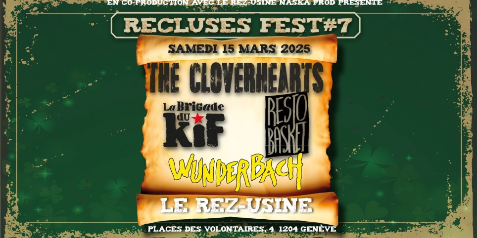 Recluses Fest#7 – Spécial Saint-Patrick ⛳️ À l'Usine - Genève: 14 & 15 mars 2025 ✨ Une coproduction exceptionnelle du Rez-Usine et Naska Prod ✨ Le Recluses Fest revient à l’usine pour sa 7 ème éditions. Complet quasiment à chaque fois, des groupes mythique à tous les coups, viens faire la fête avec nous. PROGRAMMATION 14 mars 2025 Stout : Le groupe de folk punk irlandais qui fait danser et lever les pintes à chaque note. Préparez-vous à une énergie brute et festive ! Facebook : Page officielle Clip : Rock Celtique Toxic Frogs : Les reines du celtic punk ! Ces musiciennes intrépides mélangent puissance rock et mélodies celtiques pour un cocktail explosif. Facebook : Page officielle Clip : Toxic Frogs Le Réparateur : Des textes toujours bien écrits, une musique ultra-efficace, Le Réparateur te touche dans ton petit cœur et te fait sauter dans tous les sens depuis 2008. Une guitare et une batterie, deux grandes gueules pour chanter l’amer constat d’une société pantouflarde plus préoccupée par son profit personnel et son apparence que par les vraies valeurs : le sexe, la drogue et le rock’n roll. Facebook : Page officielle Clip : Le réparateur clip Celkilt : Véritable phénomène, ce groupe de rock celtique est connu pour sa bonne humeur contagieuse et ses shows survoltés. Facebook : Page officielle Clip : On the Table 15 mars 2025 Resto Basket : Punk rock à l’ancienne, avec des riffs incisifs et des paroles percutantes. Une valeur sûre pour les amateurs de live énergiques. Facebook : Page officielle Clip : St Graal Wunderbach : Une légende du punk français. Depuis les années 80, leur répertoire mêle critique sociale et énergie brute. Facebook : Page officielle Clip : Clip Avenue des Gueules Cassées The Cloverhearts : Venu tout droit d’Australie, avec leur fusion entre punk irlandais et pop accrocheuse, ils offrent une performance pleine de bonne humeur et d’hymnes mémorables. Facebook : Page officielle Clip : Playlist officielle La Brigade du Kif : Ska festif et délirant, parfait pour clôturer la soirée dans une ambiance explosive. Facebook : Page officielle Clip : La brigade du Kif clip Tarifs Pass 1 jour (préloc) : 28 CHF Pass 1 jour (entrée) : 32 CHF Pass 2 jours (préloc) : 49 CHF (soit 24.5 CHF par soir)Frais de préloc inclus.Enfants de moins de 12 ans : gratuit. Infos pratiques Ouverture des portes : 19h30 Début des concerts : 20h Lieu : Rez-Usine, Genève Accès : Tram 14 : Arrêt Palladium Parking : Hôtel des Finances ou Gazomètres (1.- pour 4h, 2.- pour 8h, gratuit dès 19h et le week-end) Parking pour camions : 10 minutes à pied aux Vernets Engagement du Recluses Fest “Le RECLUSES FEST souhaite être un endroit safe et inclusif. Aucune forme de discrimination ou de violence n’est tolérée. Nos équipes sont sensibilisées à ces enjeux, n'hésite pas à te tourner vers elles en cas de besoin.” Pas de fascistes, pas de sexistes. Préparez-vous pour deux soirées inoubliables, entre musiques survoltées et bonne humeur contagieuse. Réservez vite vos places, les places sont limitées!