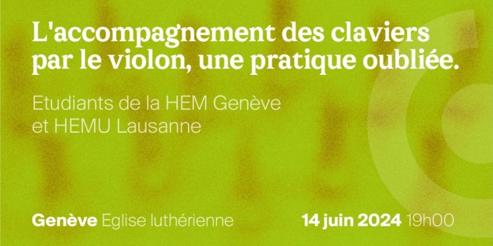 Vendredi 14 juin 2024 19h Genève Eglise luthérienne Etudiants de la HEM Genève et HEMU Lausanne La sonate pour clavier avec accompagnement de violon Ce concert sera l’aboutissement d’une année de travail avec des étudiants des deux Hautes Ecole de Musiques HEMU et HEM dans le cadre du projet de recherche intitulé : L’accompagnement des claviers par le violon, une pratique oubliée : répertoire mozartien, approches orchestrales et question de l’improvisation (1760-1800) La découverte d’un répertoire et de pratique musicales fascinante pour l’équipe de recherche et certainement également pour les auditeurs