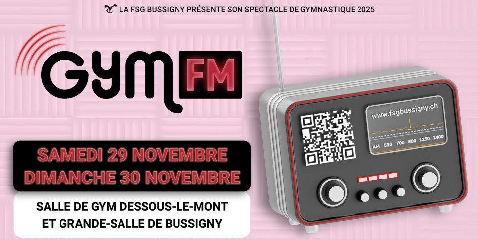 La FSG Bussigny vous présente sa soirée annuelle 2025: GYM FM Chers auditeurs, chères auditrices, montez le son et laissez-vous emporter par les ondes de GYM FM, la station la plus sportive de l’année! Découvrez la matinale pleine de pep’s avec des chroniques déjantées, des tubes entraînants et des moments d’émotion en direct. Nos gymnastes vous offrent un véritable tour de cadran radiophonique.Accrochez-vous, car ce week-end, tout Bussigny passe à l’antenne et l’ambiance promet d’être au rendez-vous! GYM FM, une soirée sur haute fréquence, pour partager des bonnes ondes les 29 et 30 novembre à Dessous-le-Mont à Bussigny.