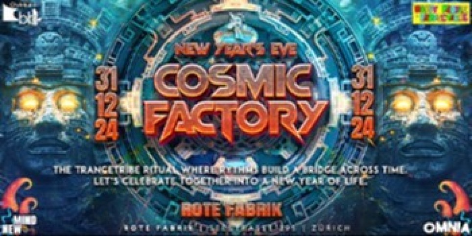 ! Tickets are also available at the party entrance itself !! Es wird noch Tickets an der Abendkasse geben ! COSMIC FACTORY NYE / New Year’s Eve / Tue 31. Dec. 2024 22:00 till open end Rote Fabrik, Seestr. 395, Zürich . Masters of the Ritual BIZZARE CONTACT - Mainstage Rec. SHIBASS - Blue Tunes Rec. / New Mind Bookings TEZLA - Prog On Syndicate Rec. SOKRATES - Nutek Rec. BASSFACTOR - BrutishHeavyMusic Rec. PHAZED - New Mind Bookings STROMI - Happy People Prod. MAD FUSION - New Mind Bookings / KF Prod. TEXOLA - Happy People Prod. BLURRYFACE - Progvision Rec. SPIRIT - Happy People Prod. NEXT STATION - Fusion Squad Music GIUSI - Happy People Prod. Room Cosmetics & Visuals by Tribes’Decorations ( Padua ), Gnelf-Art, 4U_Geckometto, Happy People & Friends Chillout Area & Fancy Shops Public Transport -> Zürich HB: S8 / S24 -> Wollishofen SBB, 10 min to walk Tram 7 -> Post Wollishofen, 5 min to walk -> Bürkliplatz: Bus 161 / 165 -> Rote Fabrik Links https://www.facebook.com/events/360511213722943 https://www.goabase.net/de/party/cosmic-factory/113887 https://linktr.ee/omnia_events Se ya there ;)