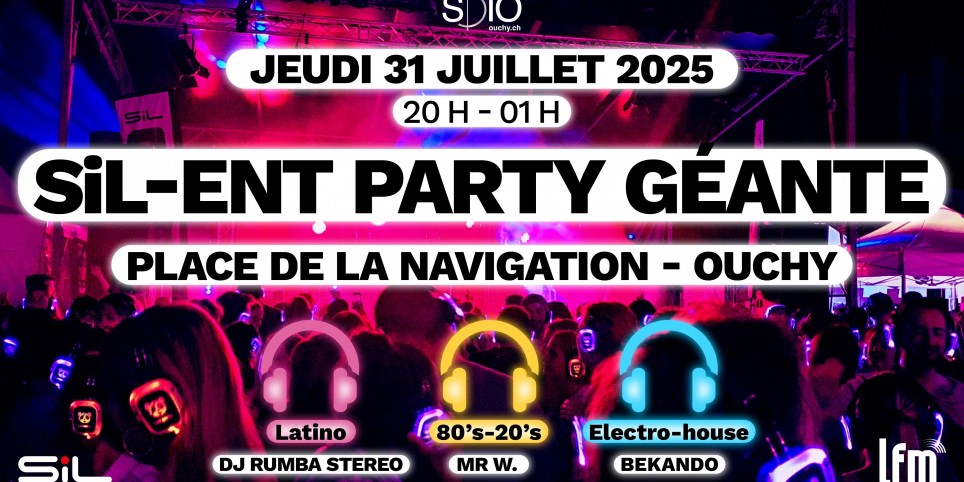 C'est parti! Venez danser avec DJ RUMBA STEREO (Latino), Mr W. (80's-20's) et BEKANDO (Electro House). Prélocation de casques à CHF 15.- jusqu'au 28 juillet. https://www.ouchy.ch/evenements/silent-party/ ➡️ Sur place, dès 19h00, au desk SDIO - OUCHY - Société de Développement des Intérêts d'Ouchy, CHF 19.- p.p. / Enfant CHF ≤ 12 ans CHF 5.- ➡️ Enfants bienvenus accompagnés d'un adulte. Carte d'identité ou permis de conduire obligatoires (caution casques).