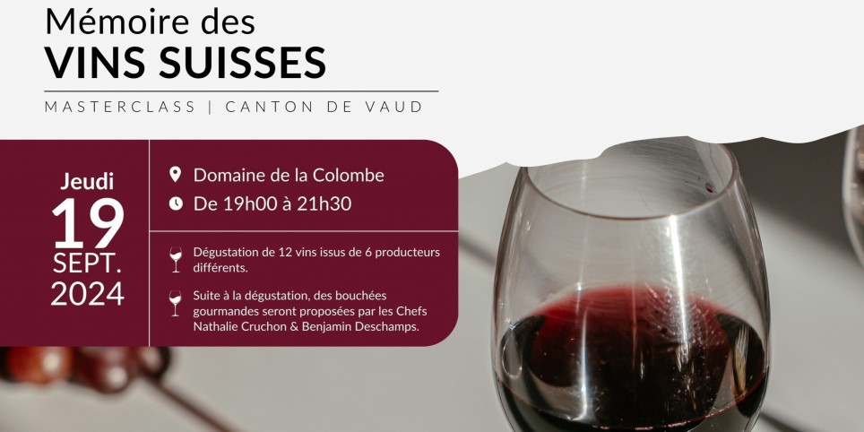 Découvrez la Masterclass d'Exception de la Mémoire des Vins Suisses Nous avons le plaisir de vous inviter à une expérience œnologique : une masterclass exclusive présentée par la talentueuse Johanna Dayer. Cet événement se tiendra le jeudi 19 septembre 2024, au Domaine de La Colombe. Une Exploration des Terroirs Suisses Cette masterclass vous offre l'occasion de déguster douze vins emblématiques issus des principales régions viticoles suisses : Genève, Valais, Vaud, Neuchâtel, Tessin, ainsi que Zurich. Chaque vin sera présenté dans deux millésimes distincts – un récent et un plus ancien – pour vous permettre d'apprécier l'évolution et la maturité des vins au fil du temps. Dégustation Guidée par Johanna Dayer Johanna Dayer, experte reconnue et passionnée, animera cette session de dégustation. Elle partagera avec vous ses connaissances approfondies sur les spécificités de chaque région viticole et les particularités de chaque millésime. Son approche pédagogique et conviviale rendra cette découverte encore plus enrichissante et captivante. Bouchées Gourmandes par les Chefs Nathalie Cruchon & Benjamin Deschamps Pour sublimer cette dégustation, des bouchées gourmandes, soigneusement élaborées par les Chefs Nathalie Cruchon et Benjamin Deschamps, seront servies, offrant ainsi une expérience sensorielle complète. Ne manquez pas cette occasion unique de perfectionner vos connaissances œnologiques et de savourer les vins suisses dans un cadre convivial et raffiné. Réservez dès maintenant votre place pour cette soirée inoubliable. Informations Pratiques Date : Jeudi, 19 septembre 2024 Lieu : Domaine de La Colombe Prix : 120.- CHF