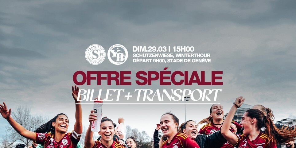 Venez encourager le Servette FCCF en Finale de Coupe Suisse. A cette occasion un déplacement est organisé par le Club en bus: départ à 9h depuis le Stade de Genève le dimanche 29 mars 2026. Programme de la journée du dimanche 29 mars 2026: Départ en bus (Stade de Genève): 9h Destination: Stadion Schützenwiese à Winterthur Match: BSC Young Boys Frauen VS SERVETTE FCCF Coup d'envoi: 15h