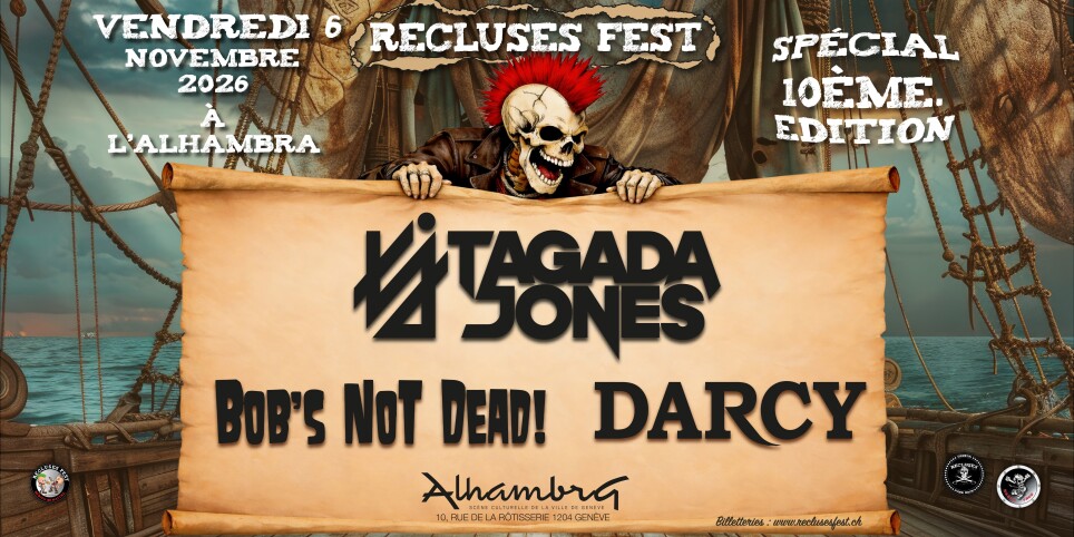 RECLUSES FEST #10 – 3 JOURS DE FEU À GENÈVE Alhambra – Genève 5 • 6 • 7 novembre 2026 Ouverture des portes 18h / début des concerts 19h15 Le Recluses Fest revient pour une 10ème édition exceptionnelle 3 soirées, 9 groupes, une ambiance unique et toujours la même énergie : live, partage, scène locale + têtes d’affiche, et une organisation 100% bénévole JEUDI 5 NOVEMBRE HOMMAGE À PARABELLUM ! Exclusivité Suisse et uniquement 3 dates en Europe en 2026 ! Parabellum, c’est plus qu’un groupe. C’est un incontournable de la scène alternative française, avec des morceaux qui ont traversé les générations. Pour célébrer cet héritage, les anciens membres de Parabellum, accompagnés de Tagada Jones, de la Famille Sven, ainsi que d’invité·e·s spéciaux, se réunissent exceptionnellement pour un hommage unique. Un tribute rare, puissant et chargé d’émotion, qui revisite les hymnes d’un groupe culte avec la sueur, l’énergie et la fougue qu’ils méritent. Préparez-vous à chanter, crier, vibrer. Parce qu’au Recluses Fest, Parabellum revit.https://youtu.be/stHRnMQt_fw?si=Aeoc76acIgaVHGzhhttps://www.facebook.com/parabellumofficiel RING OF CASH RING OF CASH transcende l’héritage des monuments de la country américaine et lui donne une nouvelle vie avec une audace créative et un son puissant unique. 2026, le duo originel Juliette Canouet (chant / ukulélé) et Mika Garcia (guitare / chant) recrute Jean-Philippe Soler (contrebasse) et Xa Mesa (batterie) : le quartet est né. Rompu à la scène auprès de nombreux artistes (Sanseverino, Dirty Fonzy, Parabellum, Opium du Peuple, Punish Yourself, Pigalle...), le groupe développe un « Power Folk Rock » irrésistible lors de lives authentiques et sans concessions. Une musique passionnée à l’énergie jouissive et contagieuse portée par la voix captivante de Juliette.https://www.youtube.com/watch?v=PqRd2LEr2lo&list=RDPqRd2LEr2lo&start_radio=1https://www.facebook.com/ringofcashduo VIKIE Une artiste à l’identité forte, entre punk, rock et chanson engagée. Une ouverture parfaite pour lancer le festival.https://youtu.be/N3Zr1ROSX7A?si=naEp6VV7LSPvgvGjhttps://www.facebook.com/profile.php?id=61552765990253 VENDREDI 6 NOVEMBRE TAGADA JONES – Nouveau show Après avoir rempli à craquer l’Usine au Recluses Fest il y a quelques années, les incontournables du punk/metal français reviennent avec un nouveau set explosif. Une référence live, toujours aussi puissante.https://youtu.be/1g8xLoH2dpw?si=QAechyjBaC5N2dpyhttps://www.facebook.com/tagadajonesofficiel DARCY Un rock engagé, moderne et incisif. Une énergie brute et des textes qui frappent fort.https://youtu.be/uc62lgeCe8M?si=-n7a8K-pRP8QYlKbhttps://www.facebook.com/darcymusic BOB’S NOT DEAD Entre chanson punk et poésie de bistrot, un projet sincère et fédérateur qui touche en plein cœur.https://youtu.be/y_o7FQma8nQ?si=YaP3k8IhiEx2aTCthttps://www.facebook.com/profile.php?id=100044489433755 SAMEDI 7 NOVEMBRE THE EXPLOITED Le groupe mythique est de retour à Genève Presque 3 ans après avoir rempli l’Alhambra, ils reviennent retourner le Recluses Fest. Une date déjà historique.https://youtu.be/8S0aD6QLTxQ?si=xRZB3IzsO_9ANiDRhttps://www.facebook.com/TheExploitedOfficialFanPage LES CLÉBARDS – Tournée 20 ans (date unique en Suisse) Une tournée anniversaire immanquable, seule date suisse. Punk rock festif et survolté garanti.https://youtu.be/K5BEMVJW-kg?si=xpFPuSFRZ8AURv35https://www.facebook.com/groups/257352089524 BAD NASTY (FR/GE) — Street PunkFormé en 1999, Bad Nasty fait partie de ces groupes qui n’ont jamais lâché l’essence du street punk : brut, direct et sans compromis. Inspiré par la scène US des 90’s, le trio balance un punk rock énergique porté par des refrains fédérateurs et une rage intacte. Après une première période marquante au début des années 2000, le groupe revient en force en 2015, désormais basé à Genève, avec la même urgence et une expérience forgée par les années. Sur scène, Bad Nasty, mené par Fredz au chant, délivre un set intense entre hymnes de rue, introspection et attitude 100% punk. Entre mohawks, spikes et tournées à travers l’Europe et l’Asie ils se sont imposés comme une valeur sûre de la scène street punk actuelle. Pour les fans de The Casualties et The Unseen.https://www.facebook.com/profile.php?id=100063517264506https://youtu.be/kjizJFbjTa8?si=qNbIWD44O7XQm5uZ UN FESTIVAL UNIQUE Le Recluses Fest, c’est : ✔️ Une asso 100% bénévole ✔️ Une programmation engagée et éclectique ✔️ Un mélange de légendes et de scène locale ✔️ Une ambiance authentique, inclusive et festive 3 jours comme ça à Genève… c’est rare. Très rare. INFOS PRATIQUES Alhambra Genève – Rue de la Rôtisserie 10, 1204 Genève Prélocs : • Jeudi / Vendredi : 28.- • Samedi : 32.- • Sur place : 35.- • Pass 3 jours (limité) : 78.- si tu calcules c’est moins de 9.- par groupe reclusesfest.ch