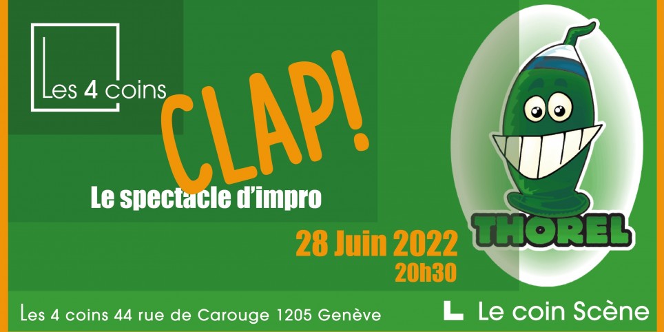 Un spectacle d’impro dynamique et rythmé par les idées des comédien·ne·s de l’équipe de la Thorel du championnat d’improvisation théâtrale de Genève!   À chaque « CLAP », tout bascule et on repart sur une nouvelle histoire, pas le temps de s’ennuyer! Spectacle à 20h30. Boissons et gourmandises au bar Les 4 Coins. Prix : 10 CHF