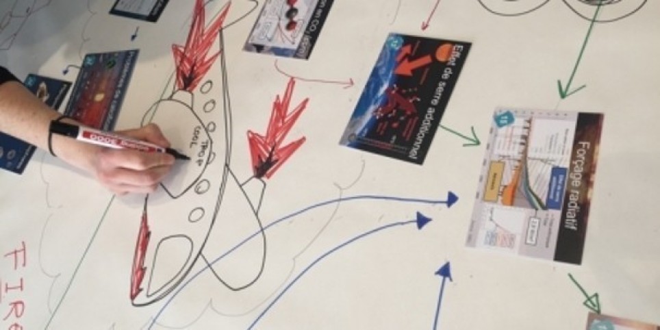 La fresque du climat, c’est tout simple : on vous donne plusieurs lots de cartes et vous faites le travail en équipe. Vous regardez ensemble ce que les cartes racontent. Vous essayez de comprendre les graphiques. Vous discutez. Vous confrontez ce que vous savez. Vous faites des liens. Vous posez une carte sur la table, puis une autre, puis une autre. La dissolution de CO2 dans l’océan, ça réchauffe ou ça acidifie ? Avec des feutres, vous tirez une série de flèches. Et si ça vous dit, vous laissez votre créativité s’exprimer : vous dessinez des arbres, des mésanges, des moules quagga, des idées bien perchées du Léman. Tout ce qui vous passe par la tête. Viendra enfin un temps pour partager vos impressions et se demander quoi faire. On parle beaucoup pendant une Fresque du climat. On se questionne. On rit. On s’étonne. On s’émeut. On apprend. On crée un grand tableau à nul autre pareil. Et quand c’est fini, tout le monde a mieux compris les mécanismes du dérèglement climatique et se sent plus armé face au gros défi. Quant à nous, les animateur-rices, nous sommes seulement là pour vous accompagner. Et nous regardons l’horloge, parce que les minutes passent vite. En fait, quand on construit une Fresque du climat, on ne voit pas le temps passer.Plus d'infos sur : https://battement.ch/oser-se-pencher-sur-les-causes-et-les-consequences-du-changement-climatique-2/
